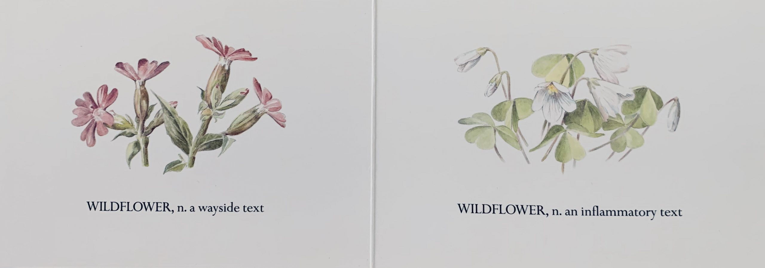 8.4 x 15.7cm, 4pp card. Two water colour paintings by Gary Hincks of wild growing flowers have two different Finlay definition works noted below each – the first is: