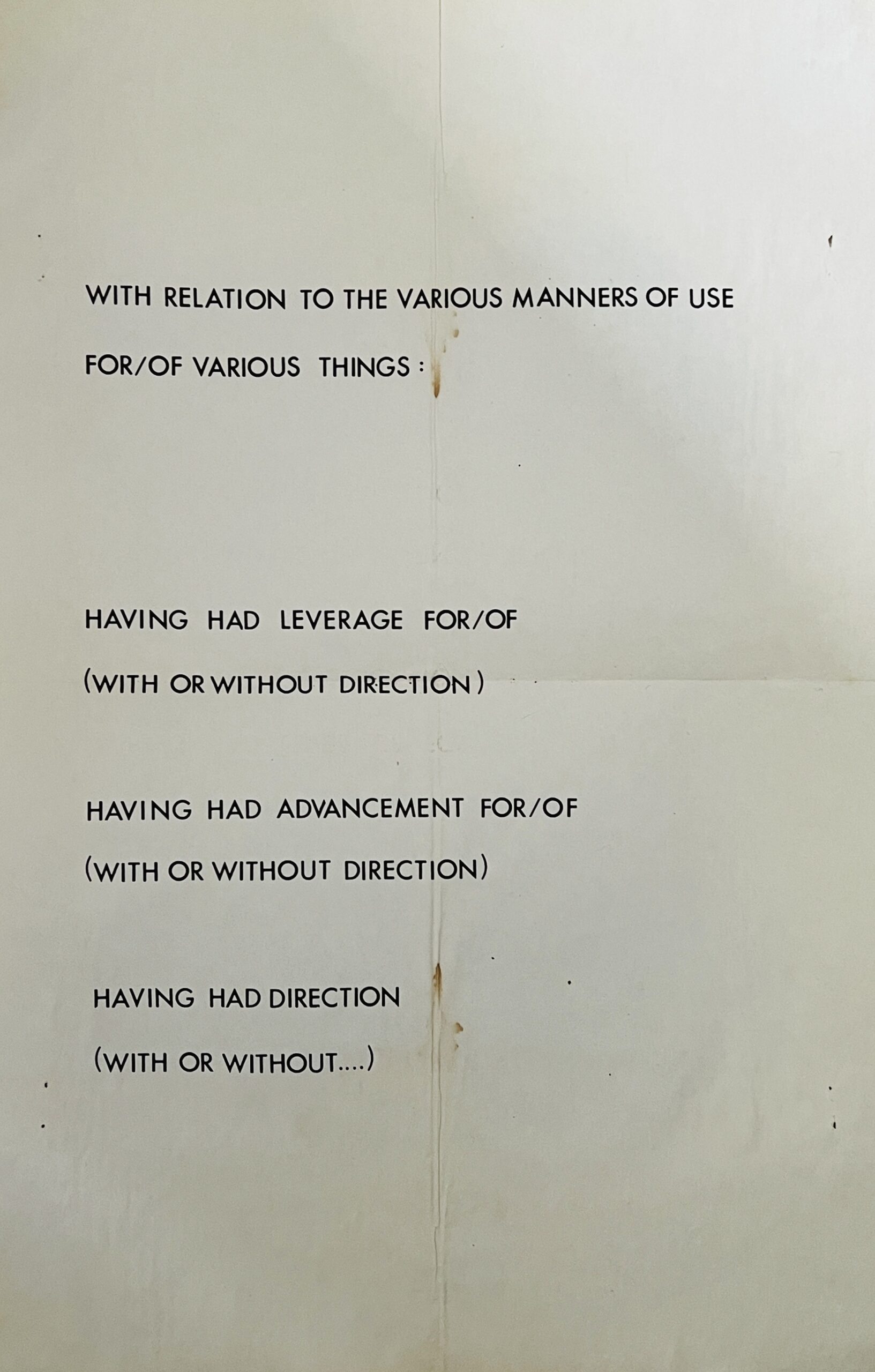 42.4 x 28cm, 1pp b/w artist deigned poster issued during a relatively early in conceptual art show. This is a very scarce Weiner item  but sadly not in perfect condition – folded for storage, couple of small pin holes and two brown marks along folds else VG. Priced thus.