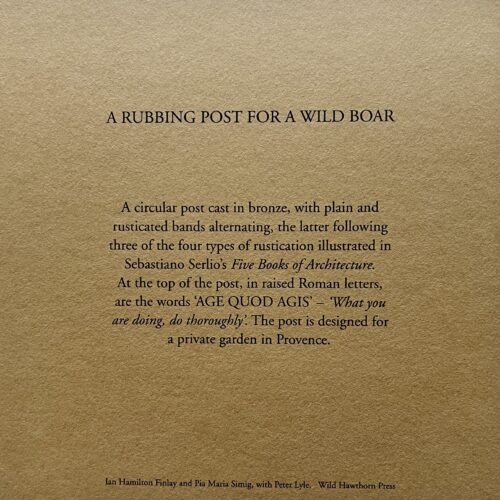 To the best of our knowledge none were actualised. The sheer number of wonderful ideas proffered by Finlay for this project is quite astonishing. This is a wonderful book although the style of the architectural drawings are strange for a Finlay collaboration - one suspects he did not choose the artist.